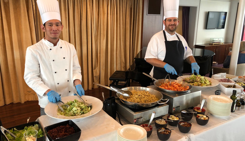 107 Männer und Frauen Besatzung für 150 Gäste, das muss man sich vorstellen. Vom Frühaufsteherfrühstück, mehrgängigem Mittagessen, Kaffee und Kuchen am Nachmittag, 5-Gänge-Menü am Abend bis zum Mitternachtssnack wird die Service-Crew nicht müde, aktiv ihre Dienste anzubieten ... und am Abend ein aufgedecktes Bett mit Betthupferl und Programm-Zeitung für den nächsten Tag. Das ist Luxus ... für mich ... Hans kennt das nicht anders (Scherz!). Wir sind durchweg positiv überrascht und genießen. Die Wassertemperatur im Pool beträgt 28 Grad.
